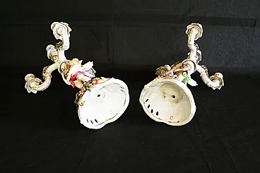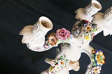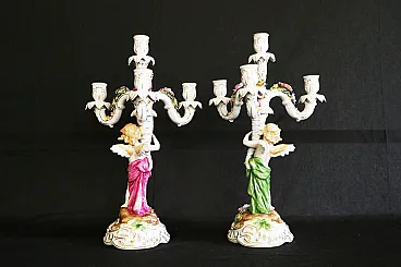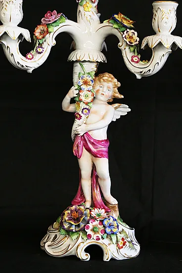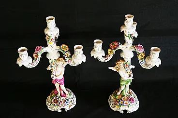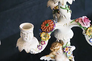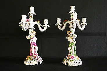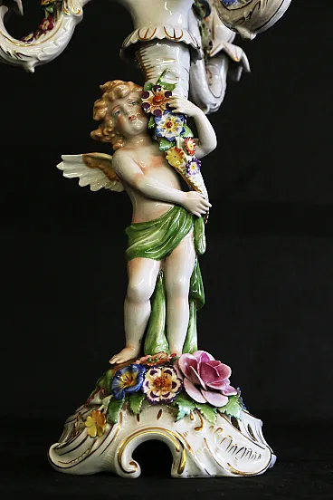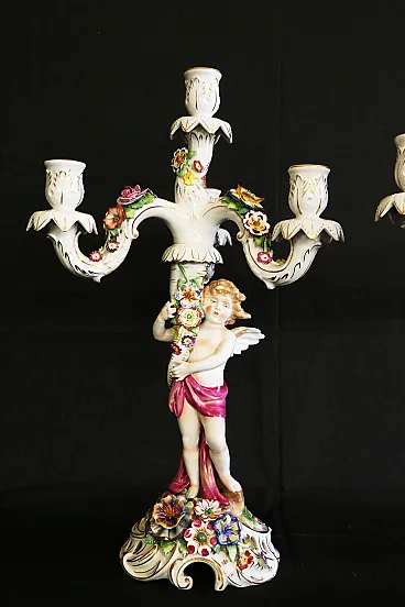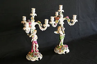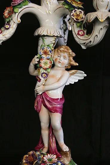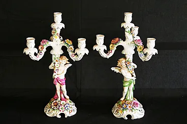 pair of polychrome porcelain candlesticks with a perforated round base, the stem consisting of a skillfully fashioned figurine of cherubs, one in green and one in pink, supporting a cornucopia from which three arms adorned with flowers and a central flame branch out.