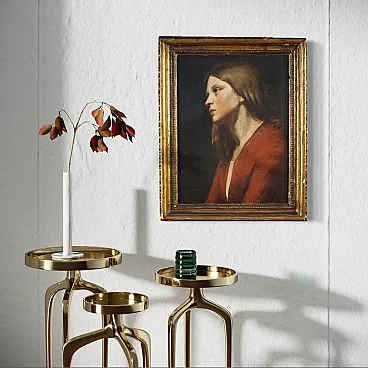 The brick red dress, with a discreet golden border, introduces a warm and vibrant chromatic note. The soft skin tones, the elegant cut of the profile and the warm color of the dress give the work an intense, intimate and contemplative quality. A painting that does not seek attention, but obtains it, a silent, cultured and profoundly human work.