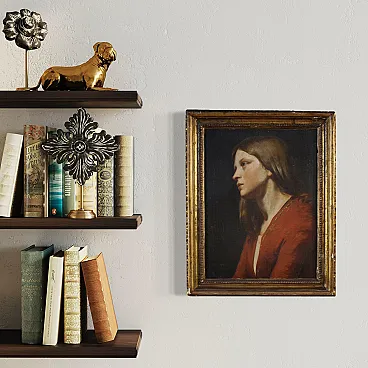 Splendid Italian painting from the mid-19th century. Oil on canvas, first canvas, depicting a wonderful portrait of a girl, rendered with great luministic delicacy and refined psychological sense. The young woman emerges from a compact dark background, a choice that focuses all the attention on the protagonist's face.