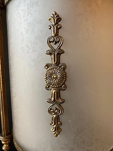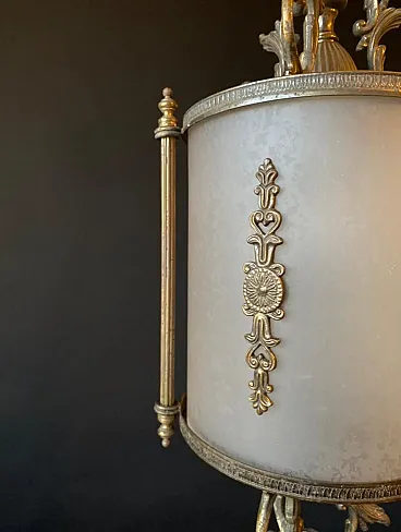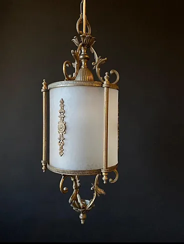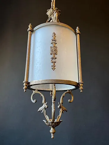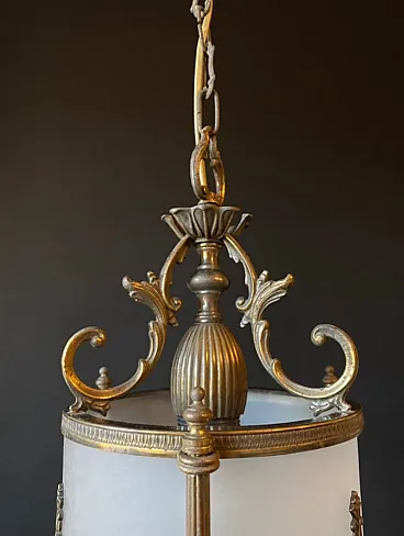 The chandelier is made of brass with bronze elements - beautiful artistic forging. The shade is made of frosted glass with decoration. A very elegant piece!