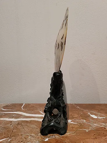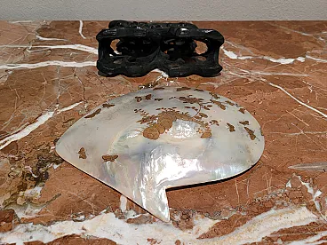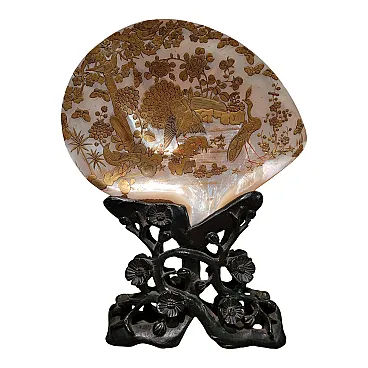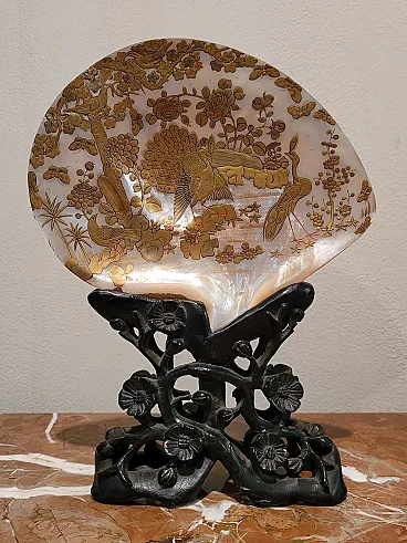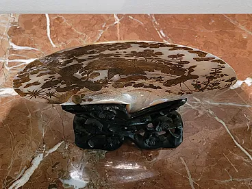 Landscape with peacocks - Engraving on golden mother-of-pearl shell