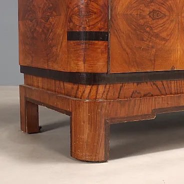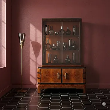Sliding-door display cabinet with storage compartment and hinged doors from the Deco line; walnut burl veneer with exotic wood inserts, metal handles.