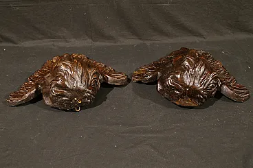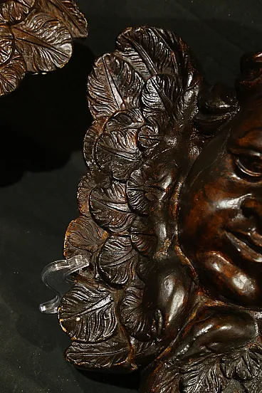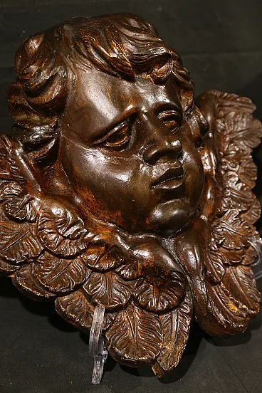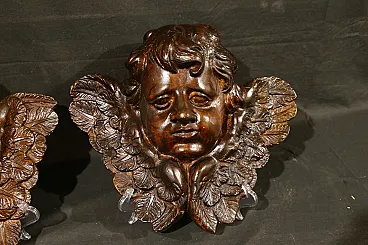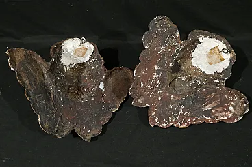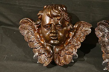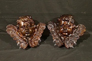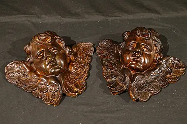 Pair of plaster Cherubs finished in imitation wood from the Baroque period, dating back to the 18th century, of Italian manufacture.