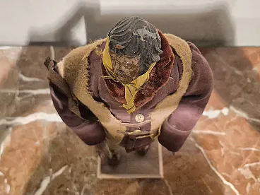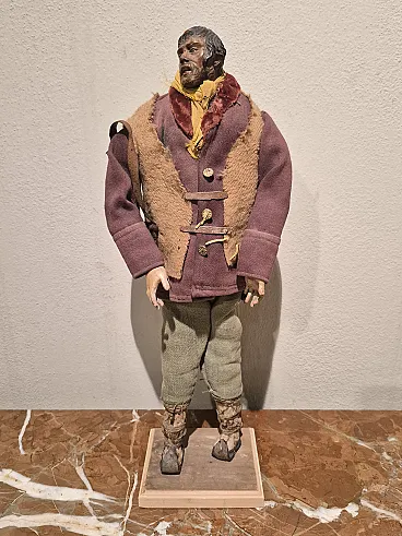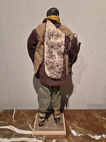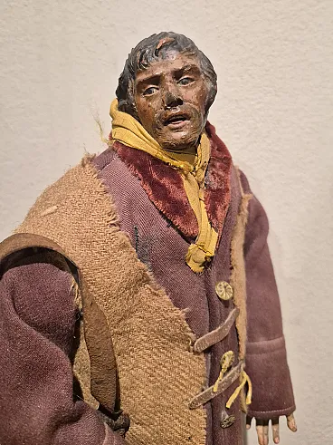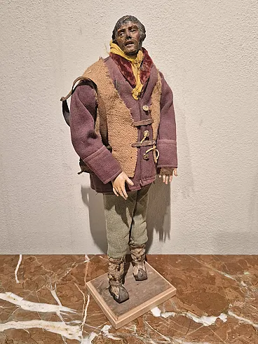 Nativity scene statue in terracotta, glass and polychrome fabric, Naples, late 18th century depicting a shepherd with brown jacket and bag. There are small defects. - Head and limbs material: terracotta - Eyes material: glass - Clothing material: cloth - Origin: Naples, Italy - Period: late 18th century - Dimensions (W x H x D): 17.0 x 43.0 x 10.0 cm