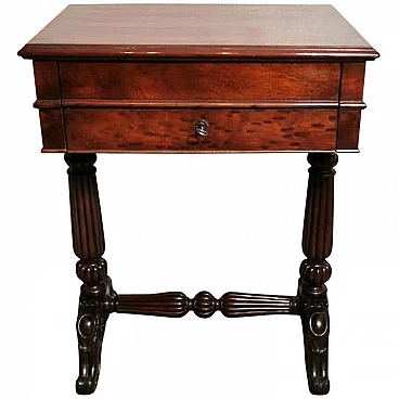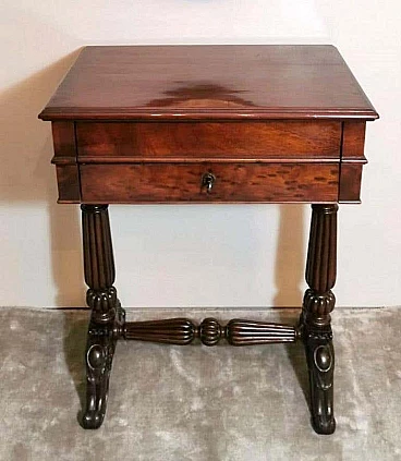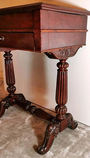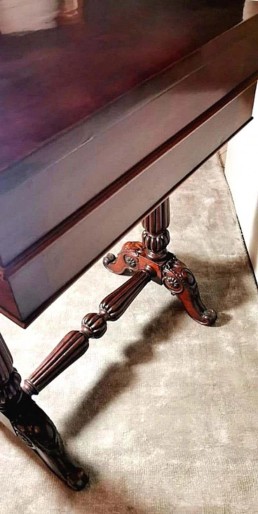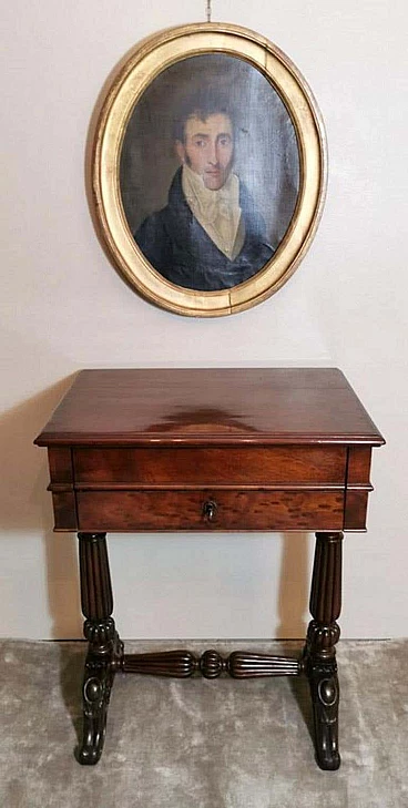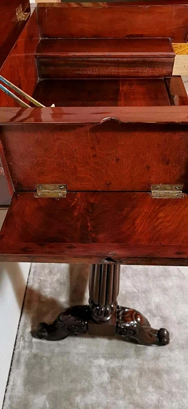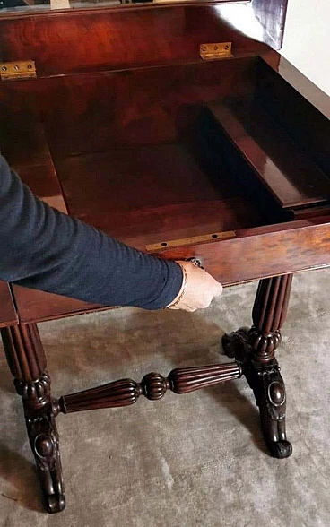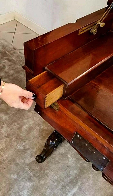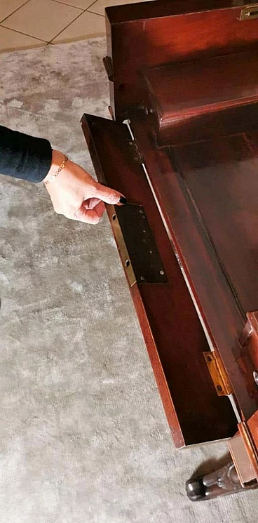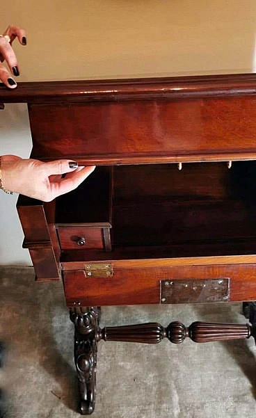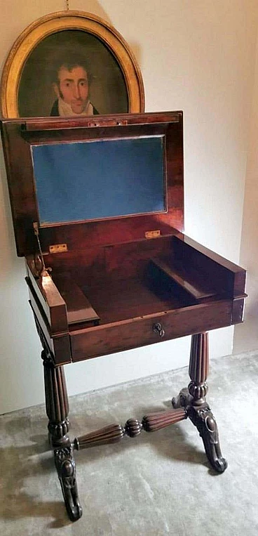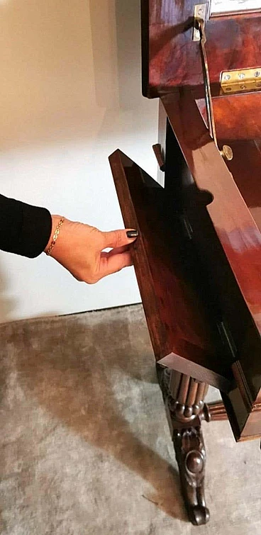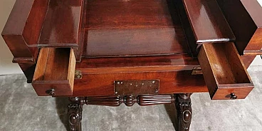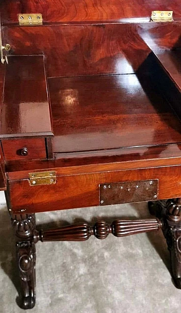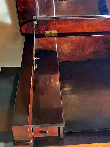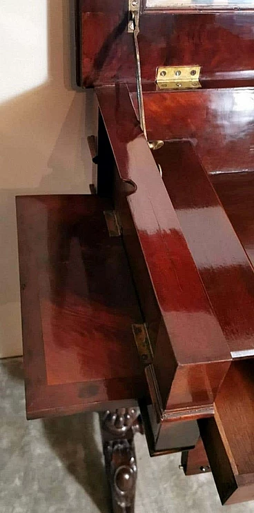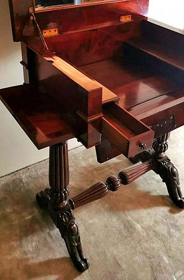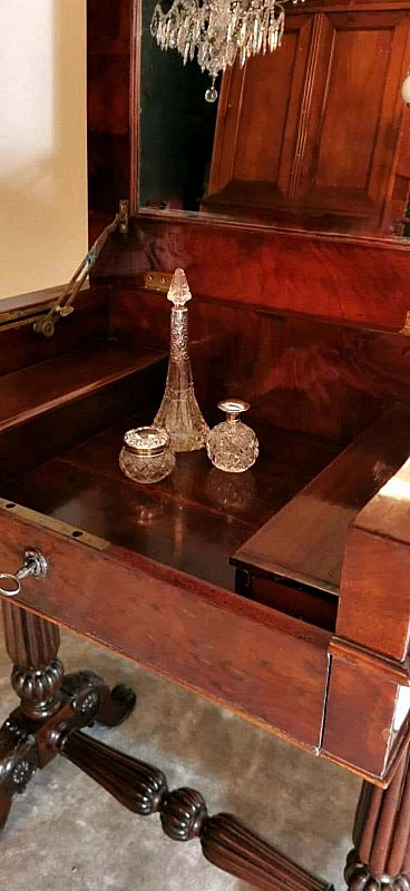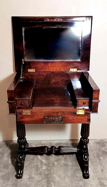 Dressing table in fine mahogany feather, finished on four sides so that it can be placed on the wall or placed in the middle of the room to enjoy its aesthetics even at 360 °. The upper part, linear and uniform, is supported by two elegant supports separated from each other by a crossbar, everything is made with a refined and sophisticated pod processing. But the beauty of the toilet and the number of potential uses, can be appreciated when we lift the upper mobile top: this is provided inside a mirror, and, through metal support, can be stopped in a vertical position. We also discover that, by lowering the hinged front part, it is possible to use the large side drawers. On the left side of the dressing table we can also lower a practical shelf. Many features to make the vanity table practical, comfortable and rational (you can follow these operations in the succession of photos). The piece of furniture was made in England between 1848 and 1850 with mahogany burl, a portion of very fine solid wood, characterized by an elegant natural design with feather-like spots. The toilet was treated with natural products and methods used in the English artisan workshops of the 1800s, even the polishing was carried out with a cotton swab soaked in shellac and straw oil with pumice stone powder.