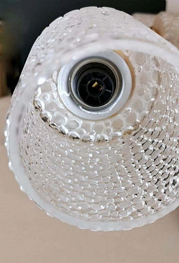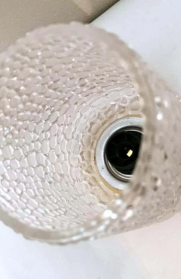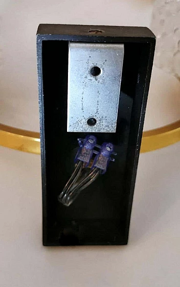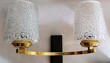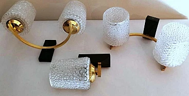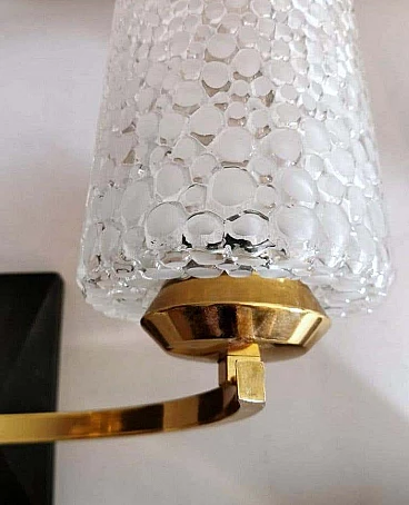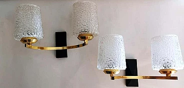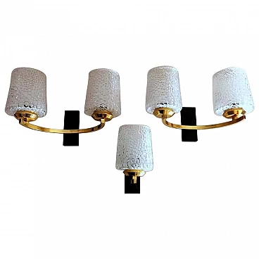 Three wall sconces with a refined and pleasant design, produced in France in Arlus style (Art and Lustre) between 1958 and 1960. Maison Arlus was a French lighting manufacturer, very active since the 1950s and close to the modern design movement. The structure of each one, made of brushed and polished brass, is essential but of valuable workmanship, the fixing plates to the wall are made of brass stove enamelled black, all the light points of the wall sconces are provided with half-crystal glass (unlike crystal, the glass from which the half-crystal is produced does not contain lead, is facetted by machine and then put in an electric furnace to make the edges of the faces less sharp, then hot-polished or fire-polished to give it a bright and shiny finish with an ice effect) with a slightly conical shape. After the classic processing of the half-crystal on the five glasses, a matt grinding has also been carried out to create a pleasant contrast. The electrical system has been completely redone (see photo on the back of the black plate) with U.S. wiring, the compatibility of voltage in other states must always be verified by an electrician before use.