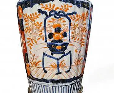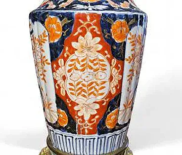 Porcelain body: The vases feature the classic “Imari” color palette: underglaze cobalt blue, iron red, and touches of pure gold. The rich and detailed decoration depicts flower baskets (ikebana), stylized floral motifs, and geometric reserves typical of Arita production.