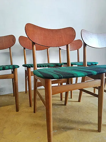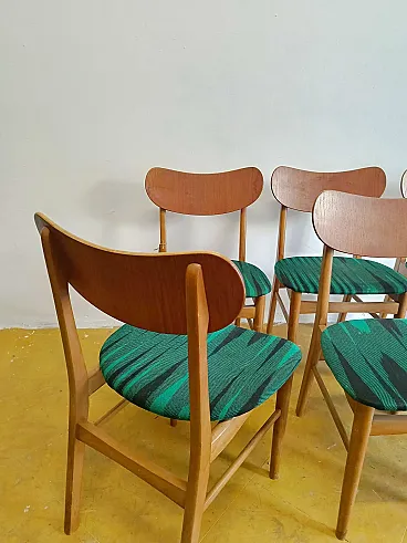 Set of 6 vintage Scandinavian teak chairs with green padded seat, perfect for mid-century modern furnishings and large dining areas. These 1960s Danish chairs with original green fabric upholstery combine traditional Nordic construction and a bold chromatic touch, ideal for large tables or to complete existing sets with customizable seats to be reupholstered.