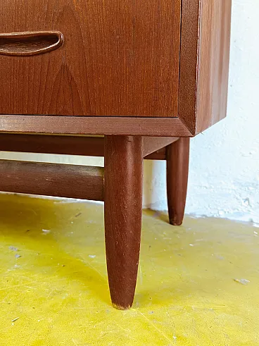 Distinctive Features Scandinavian Design The distinctive feature lies in the particularly large horizontal configuration where the six rows of drawers maximize storage capacity while maintaining limited height. The fronts show particularly regular linear teak grains with warm shades that create a uniform harmonious visual effect. The recessed shell-shaped handles arranged symmetrically on each front represent an elegant and functional solution. The upper drawer has a central lock for the safety of valuables. The base has a distinctive structure with four tapered conical legs connected by a horizontal crosspiece that runs along the entire width, adding a visual element that lightens the perception of the overall volume, creating contrast between the massive body and the slender base.