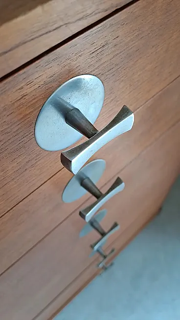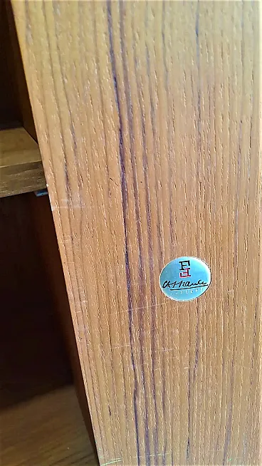 Distinctive Features Design Finn Juhl Cresco The distinctive feature lies in the system which develops both horizontally and vertically, occupying the entire wall and creating a significant architectural presence. The upper part shows open compartments of variable heights and widths which allow flexible containment of books, decorative objects and documents, demonstrating the configurative flexibility through standardized elements. The lower section integrates closed elements with hinged doors that feature horizontal teak grain and circular knobs hiding dedicated storage, as well as a chest of drawers with five drawers also equipped with circular knobs that provide uniform visual rhythm. This combination of open and closed storage is testament to Juhl's approach to complex domestic functionality. The symmetrical configuration creates visual balance and compositional harmony while maintaining dynamism through the variety of modules.