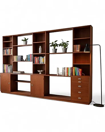 "Cresco" Finn Juhl modular bookcase for France & Son, vintage 1966s in teak with articulated modular wall system, symmetrical configuration with open compartments of different sizes, hinged doors with horizontal grain, chest of drawers with five drawers and circular knobs, perfect for a monumental Scandinavian mid-century living room. This impressive bookcase designed by master Finn Juhl represents the pinnacle of Danish modular systems where compositional complexity meets the assembly of standardized elements, ideal for environments seeking a significant architectural presence with complex domestic functionality and excellent craftsmanship quality.