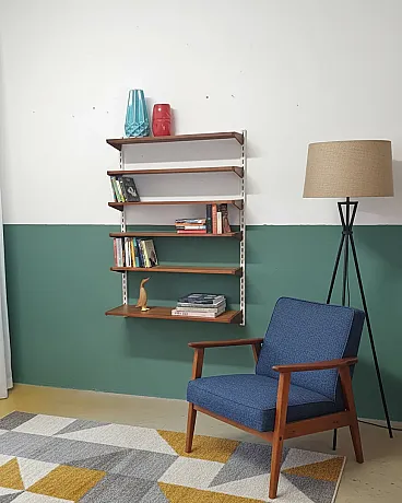 Distinctive Features Design Kai Kristiansen The distinctive feature lies in the vertical uprights in white enamelled metal with regular drilling along the entire height which allow free adjustment of the positioning of the shelves through quick-attach metal brackets. This technical solution guarantees infinite configurations without the need for tools, a fundamental principle of modular systems that favor the user's autonomy. The teak shelves show different depths which create a dynamic and asymmetrical composition testifying to the versatility of the system. The natural grain of the wood and the patina of use give it an authentic character while the rounded front edges soften the rectangular geometry. Generous thickness ensures substantial load-bearing capacity for books and items. The contrast between the industrial white of the uprights and the organic warmth of the teak creates a visual balance characteristic of the Kristiansen design.