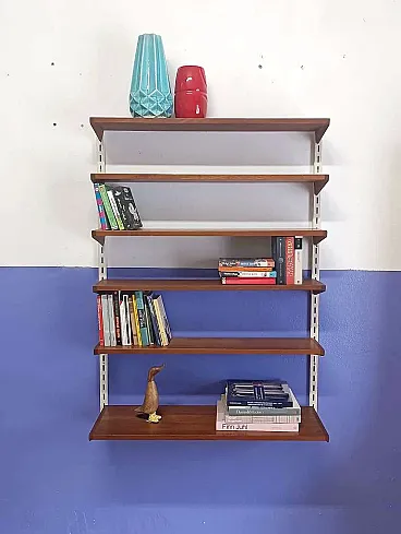 Vintage 1960s Kai Kristiansen wall bookcase in teak with modular rack system, perforated white vertical metal uprights, six adjustable shelves of different depths that create a dynamic asymmetrical composition, perfect for a paradigmatic Scandinavian mid-century living room or study. This refined bookcase signed by designer Kai Kristiansen represents the excellence of the Nordic design philosophy where the combination of industrial and natural materials meets functional adaptability, ideal for environments that seek a flexible solution with long-lasting aesthetic quality.