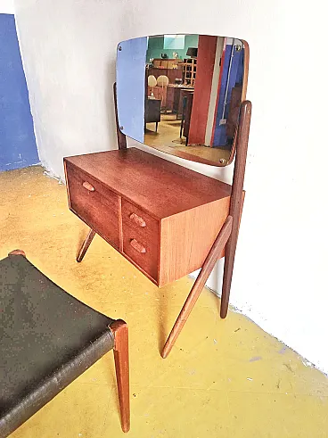 Vintage Danish 1950s dressing table in teak with rectangular mirror, tapered legs, two drawers, shell handles, perfect for a refined Scandinavian mid-century bedroom. This elegant Danish dressing table represents Nordic design excellence where functionality meets compact proportions, essential configuration, ideal for domestic spaces looking for space-saving solutions without compromising aesthetic quality.