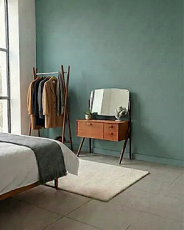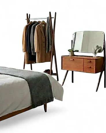 Distinctive Features Scandinavian Design The distinctive feature lies in the four tapered legs which elegantly taper downwards, giving visual lightness despite the presence of the upper mirror. The two drawers have integrated shell handles, a typical solution that favors cleaning surfaces while maintaining ease of use. The rectangular mirror with rounded corners is supported by side uprights that develop from the rear legs creating elegant structural continuity. Fixing system with discrete metal elements testifies to attention to design technique.