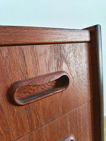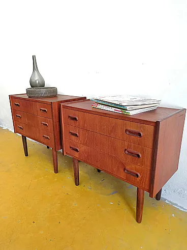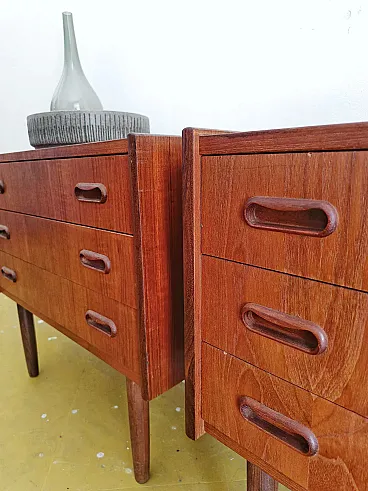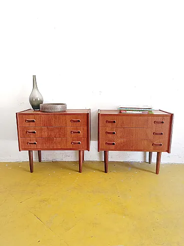 Pair of vintage Danish 1950s teak bedside tables with three large drawers, discreet rounded handles carved directly into the fronts, slightly inclined cylindrical legs and warm smooth finish, perfect for a minimalist Scandinavian mid-century bedroom. This elegant pair represents the excellence of functionalist Nordic modernism where beauty lies in the integration and simplicity of forms, ideal for modern or classic interiors seeking versatility with authentic artisan quality.