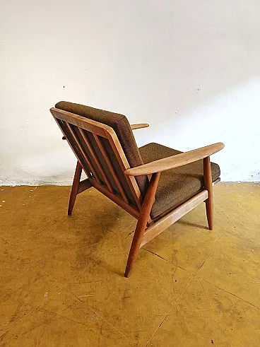 The supporting structure is entirely made of teak with a natural oiled finish that enhances the amber shades and rich grains of the tropical wood, a material that the Danish masters favored for its dimensional stability and ability to develop warm patinas through decades of daily use. The Danish production of the sixties represents one of the highest moments of Nordic craftsmanship applied to upholstered seating, when traditional knowledge of woodworking was combined with new upholstering techniques to create armchairs with superior comfort destined to become the fulcrum of contemporary living. The traditional joints visible in the structure testify to the craftsmanship used in its creation, while the clean design maintains an aesthetic relevance that goes beyond the temporary trends of modern rest furniture.