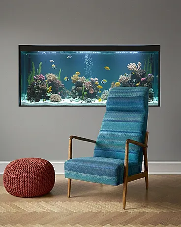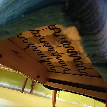 Distinctive Features Swedish Design The high back allows good head support designed for comfort and relaxation. The slightly inclined rear legs and the deep seat guarantee a relaxed posture typical of lounge chairs of the period. The teak structure has soft lines and rounded corners that give a warm welcoming appearance. The striped blue fabric covering blends harmoniously with the warm tone of the wood, creating an interesting visual contrast with the simplicity of the loom, testifying to the textile style of the sixties when bright colors and textures added character and personality.
