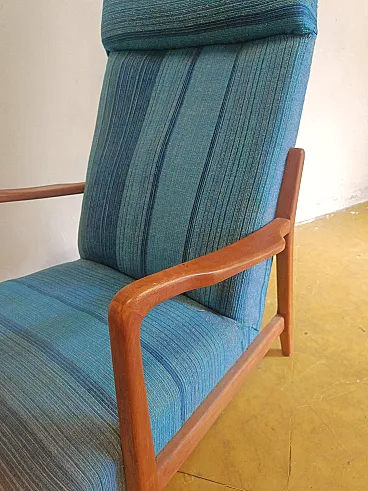 Vintage Swedish lounge chair from the fifties and sixties in teak with a high backrest that offers good head support, soft lines with rounded corners, deep seat for a relaxed posture, slightly inclined rear legs and striped blue fabric upholstery, perfect for a cozy Scandinavian mid-century living room. This beautiful armchair represents the excellence of functional Nordic design where simple lines meet elegance with high quality natural materials, ideal for modern or vintage environments looking for an iconic piece of furniture with comfort and authentic relaxation.