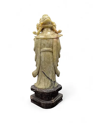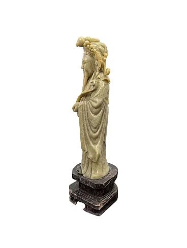 The statue rests on an octagonal base in contrasting colored stone, carved with Greek motifs. As for the era, the style of the carving and the patina of the stone suggest production dating from the late 19th century to the first half of the 20th century (late Qing dynasty or Republic period), an era in which these objects were very popular both for the domestic market and for export to the West.