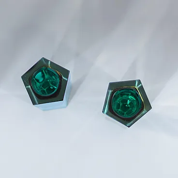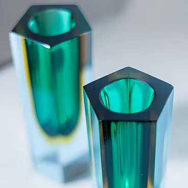 Pair of Sommerso Murano glass jars / candle holders from the 1950s, Design Falvio Poli. Elegant Murano glass artefacts characterized by layers of green and yellow glass that create a compelling sensation of depth and light. Set produced in the 1950s in the historic Murano furnaces, which embodies the refined craftsmanship and clean lines of the time, perfected with the Murano "Sommerso" technique, a layered technique in which one or more colored glass cores are "submerged" under a thick layer of transparent crystal. In the furnace, the colored core is repeatedly dipped into molten clear glass, creating layers that produce optical depth, internal luminosity and a suspended light effect. It requires precise timing and thermal control and is a hallmark of post-war Murano glassmaking. In excellent condition: original shine with minimal signs of age which enhance its provenance. Ideal as a sculptural object on tables or shelves, or as a decorative element in modern interiors.