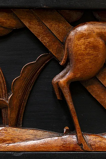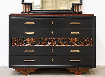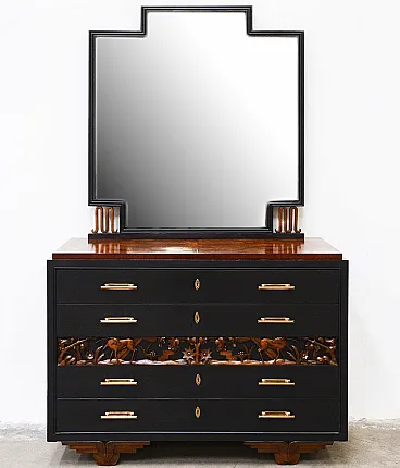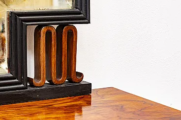 Of particular workmanship and beauty, it is made of walnut burl and decorated with geometric motifs in the feet and mirror, mixed with naturalistic motifs on the front, where there is a band carved with plants and animals where there are slight, irrelevant, shortcomings