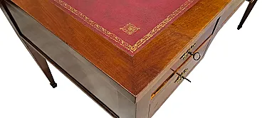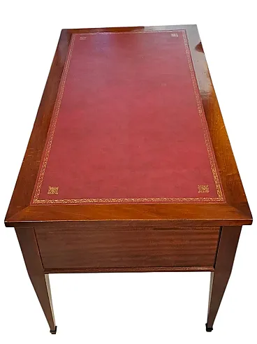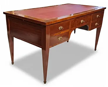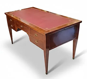 Refined French desk in mahogany wood and mahogany feather, characterized by sober and geometric lines typical of the transition between the late 18th and early 19th centuries. This piece perfectly combines operational functionality with the aristocratic aesthetic of European studio furniture.