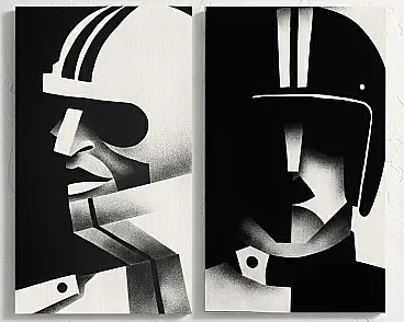 This pair of works captures the heroic essence of racing pioneers, where man and machine become a single geometric entity. Through a Neo-Futurist language, the faces of the pilots emerge from a deep background, defined by a graphic synthesis that celebrates dynamism, tension and pure concentration. They are not simple portraits, but icons of an era in which speed was a constant challenge to the limit.