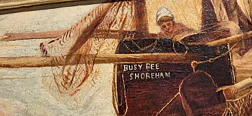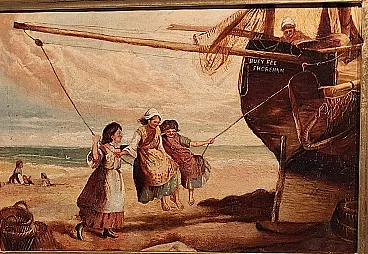 Copy of children playing on a wooden fishing boat, written "BUSY BEE SHOREHAM" on the stern, with lobster pots and other children playing in the sand.