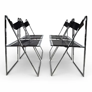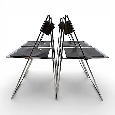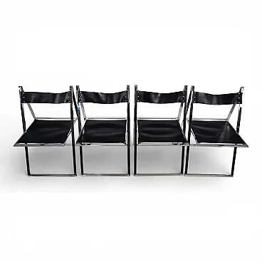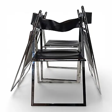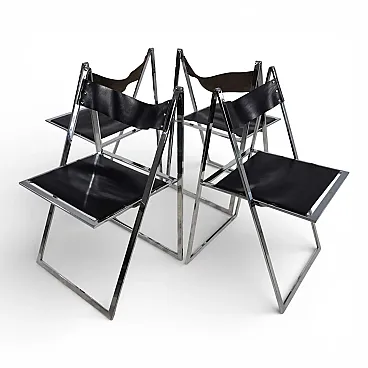 This delicate and elegant set of four folding chairs in chrome and leather is in excellent condition. Designed in 1969 by the Italian design duo Fantoni & Geraci, it has become a classic in the folding dining chair segment. Black leather seats offer exceptional comfort thanks to the tension springs underneath and show no signs of wear. The chrome-plated metal structures, which fold over with a hinge at the top, have only a minimal patina. A true timeless classic.
