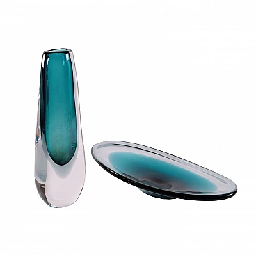 Blown glass vase and centerpiece signed Kosta Boda manufacturing. Vase signed under the base Kosta LH 1421. Centerpiece signed Kosta LH 1362/99. Vase's height 37.5. Centerpiece's lenght 43,5, depth 20,5, haight 7.