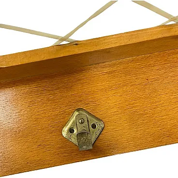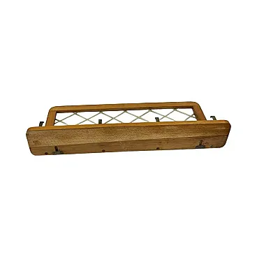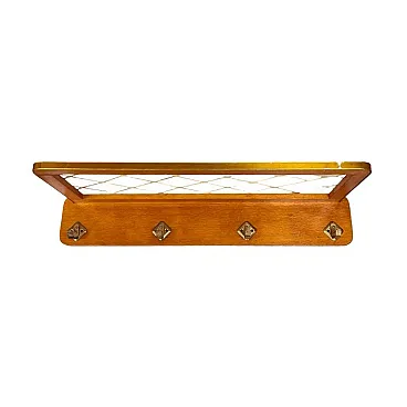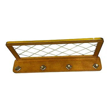 This iconic coat rack is an authentic design by Rudi Volket, a prime example of German design from the 1950s. The piece is crafted in the prestigious Brussels style, characterized by visual lightness and geometric precision. A solid wooden base in a warm, honey-colored shade is paired with a practical shelf for hats. The most recognizable element of this model is the decorative white mesh with a diamond pattern, which gives the entire piece a unique mid-century modern character. The coat rack is equipped with four original metal hooks with a classic, rounded shape.