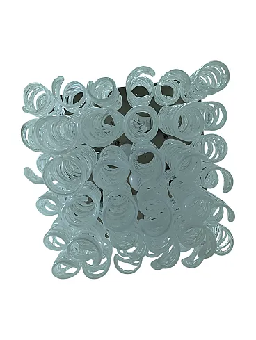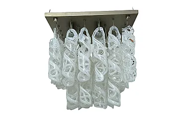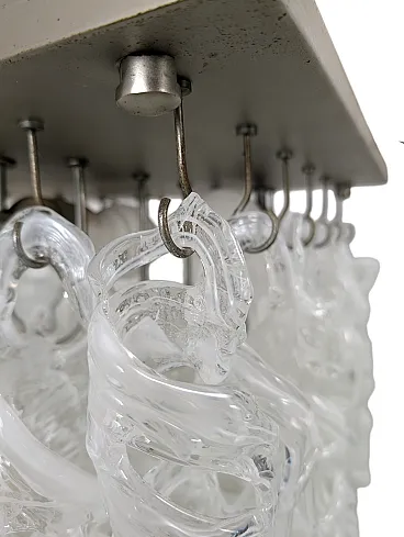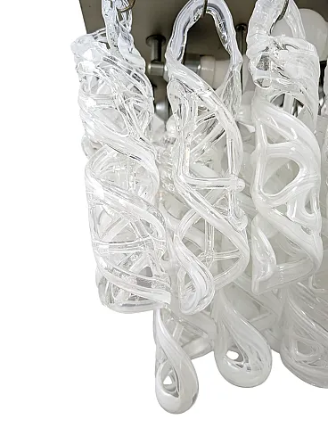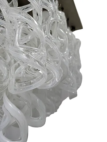 The glass, characterized by a filigree interweaving of milky white and crystalline transparencies, creates a suggestive effect of organic movement reminiscent of ice sculptures or stylized waves. Once turned on, the chandelier diffuses a soft and refracted light, transforming the individual glass elements into luminous prisms that give the room a luxurious and refined atmosphere.