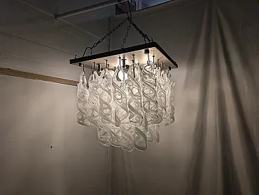 This refined pendant chandelier embodies the elegance of Venetian craftsmanship through a contemporary and dynamic design. The square-based structure in satin-finished metal supports a dense cascade of Murano glass pendants, handmade with a distinctive spiral workmanship.