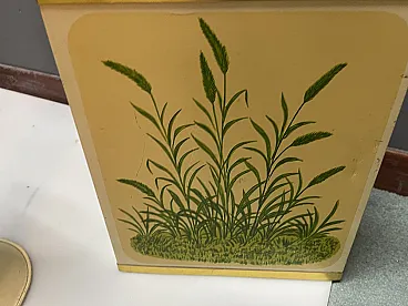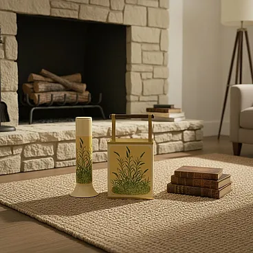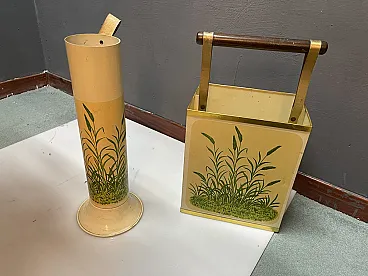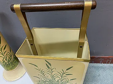 Vintage Umbrella Stand and Newspaper/Firewood Rack, 1950s Charming mid-century umbrella stand accompanied by a matching rectangular newspaper rack dating to the 1950s. Made from painted tin with brass detailing and finished with a solid wooden handle, the set reflects the functional elegance typical of post-war European design. Both pieces are decorated with a delicate botanical pattern, adding a light decorative touch while maintaining a clean and practical silhouette. The rectangular piece was originally intended to hold newspapers or magazines, but its sturdy construction also makes it suitable as a small log holder or log holder next to the fireplace. Ideal for the entryway, hallway or living room, this versatile set combines everyday functionality with authentic vintage character. Materials • Painted milk jug • Brass details • Wooden handle Dimensions Shawl holder • Height: 45 cm • Width: 17 cm • Depth: 17 cm Newspaper/magazine/firewood holder • Height: 60 cm • Width: 27 cm • Depth: 18.5 cm Conditions Good vintage condition with signs of wear consistent with age and use. A set of decorative and practical mid-century accessories that bring warmth and character to both modern and traditional interiors.