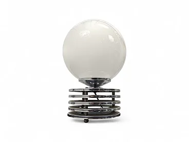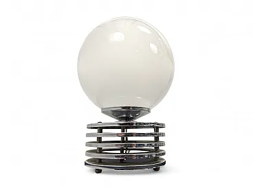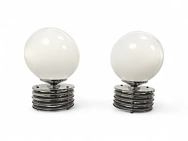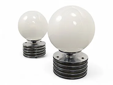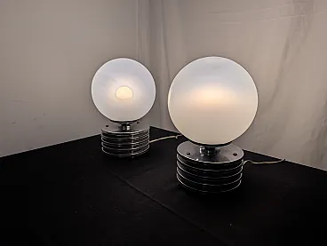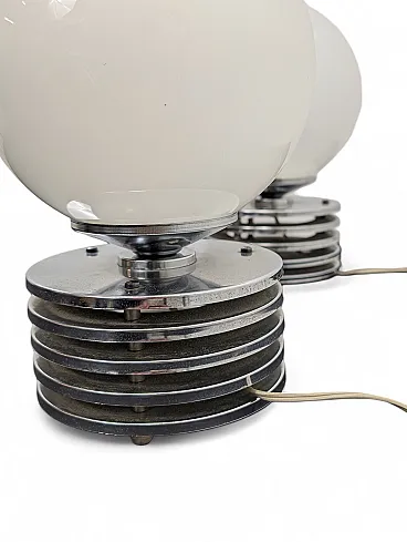 These elegant table lamps represent a refined example of Space Age design from the 1970s, characterized by an overlapping disk structure in chromed metal that recalls the futuristic aesthetics of the period. The sculptural base supports a large spherical diffuser in white opal glass, which diffuses a soft and uniform light, creating a suggestive visual contrast between the industrial solidity of the support and the ethereal lightness of the cap. The objects are in excellent vintage condition, retaining the original brilliance of the chrome plating and the integrity of the glass, with only very slight signs of aging which attest to their authenticity and historical charm.