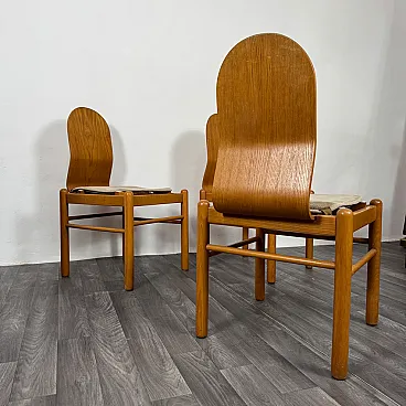 The chairs feature a solid solid wood structure with round legs and reinforcing crosspieces, typical of the Nordic design of the time. The curved wooden backrest offers ergonomic and enveloping support, combining comfort and minimalist refinement.
