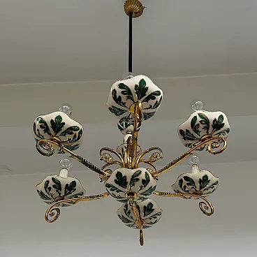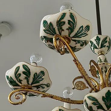 Floral ceramic and brass chandelier, 1950s