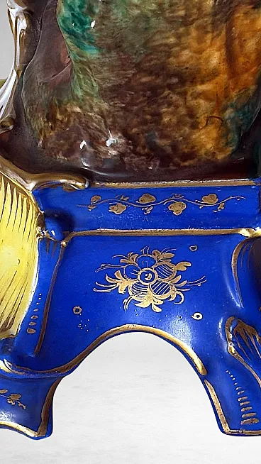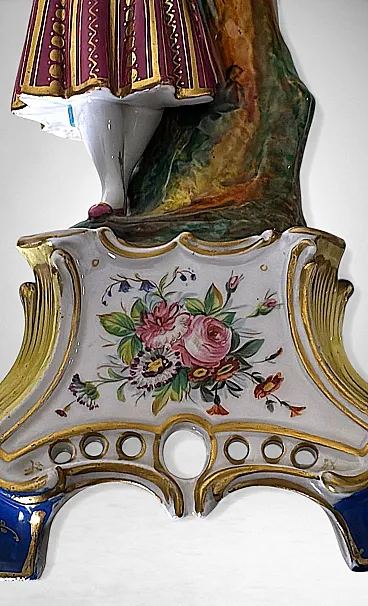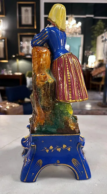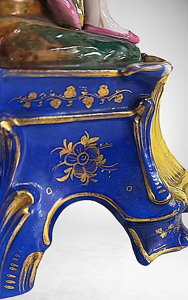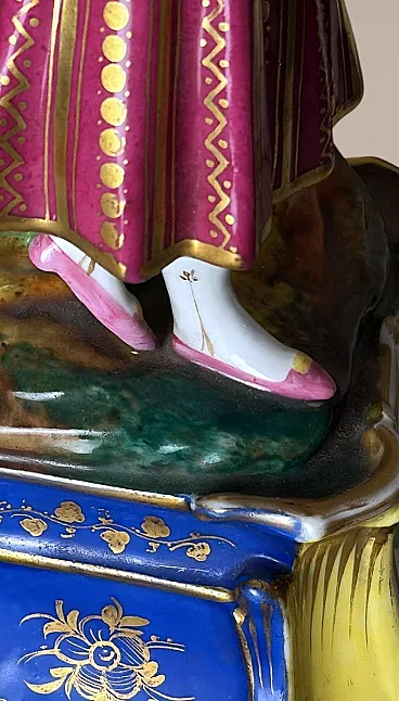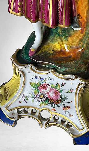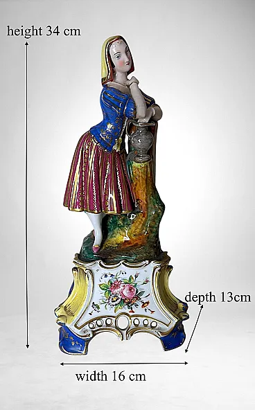 Elegant and refined polychrome porcelain figurine in the Napoléon III style, attributed to the workshops of Porcelaine de Paris and dating from around 1854 to 1860. It was most likely produced by one of the many Parisian ateliers active in the mid-19th century, part of the vibrant network of fabriques de décorateurs, though not necessarily linked to the principal manufactory. The model depicts a young woman leaning against a small fountain, rendered with remarkable finesse in the facial features, the delicately rosy complexion, and the details of her dress, all hand-painted in vibrant colors with accents of pure gold. The shaped base, decorated in the characteristic bleu de roi with floral reserves, is a distinctive element of Parisian porcelain production of the second half of the 19th century. Workshops associated with Porcelaine de Paris did not always apply a factory mark, often preferring internal numbers or initials, as is also the case with this figurine. The piece clearly reflects the qualities that made Parisian porcelain so admired: soft modeling, refined hand-painting, and an elegantly theatrical decorative taste in perfect harmony with the Romantic sensibilities of the period. An ideal piece for collectors of 19th-century French figurines and a sophisticated decorative accent for classic interiors, boiseries, bookshelves, or consoles. Historical Note on Porcelaine de Paris: “Porcelaine de Paris” does not refer to a single factory but to a constellation of workshops, decorators, and small manufactories active in the French capital from the 18th century onward. Their most intense period of activity was between 1830 and 1870, producing high-quality porcelain for an increasingly discerning bourgeois clientele.Key characteristics include: deep cobalt blue with floral reserves, generous hand-applied gilding, romantic subjects, elegant or pastoral scenes, soft modeling, and sweet, idealized faces. Decorative figurines were a particular specialty, often created for mantelpieces, consoles, dressing tables, and living-room garnitures. The absence of a mark is not an indication of lower quality: many Parisian workshops favored stylistic recognizability over signature. The figurine is in good condition. Dimensions: Width 16 cm (6.3 in), depth 13 cm (5.1 in), height 34 cm (13.4 in).