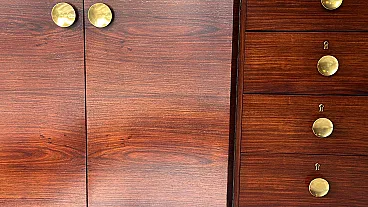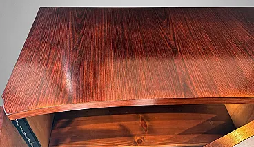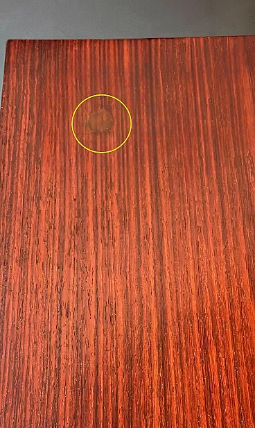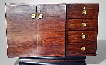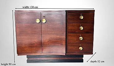 This distinctive and original Italian Art Deco sideboard is crafted from fine Sapele wood. The front section, slightly projecting from the main body of the cabinet, is characterized by an elegant curved profile that breaks with traditional linear design. To emphasize this refined feature, the cabinetmakers oriented the wood grain of the doors horizontally, intelligently enhancing the flowing, wave-like aesthetic of the façade. This thoughtful design choice also harmoniously influences the shape of the top surface. The spacious and functional interior, fitted with a shelf, is made of polished light pinewood, creating a pleasant and luminous contrast with the darker exterior. On the right side, the sideboard features four practical drawers, each fitted with its original lock. All handles are original, crafted in brass, with a concave circular form and a clean, understated design. The solid and substantial base is recessed within the perimeter of the cabinet and finished with refined black wooden trim, adding both visual balance and structural solidity. This sideboard was expertly crafted between 1930 and 1935 by skilled master cabinetmakers in the area of Lendinara, in the province of Rovigo, Italy—one of the most prestigious furniture-making districts in the Veneto region—and represents an excellent example of high-quality Art Deco craftsmanship. Sapele, a noble and highly prized hardwood of African origin, was used in the construction of this piece. Known for its warm reddish hue reminiscent of mahogany, Sapele comes from Equatorial Africa and is distinguished by its fine, tight grain, interlocked fibers, and natural luster. Strong yet flexible, dense and durable, this wood has traditionally been employed in luxury furniture, fine cabinetry, yacht interiors, and high-end musical instruments. The entire structure was built in solid Sapele and subsequently veneered with carefully selected sections of the same wood, chosen for their particularly rich and varied natural grain patterns. The final hand-polished finish enhances the depth of color and dramatic figuring of this exceptional exotic wood, giving the sideboard a uniquely elegant and sophisticated appearance. The artisans conceived this piece as a compact yet visually striking object, defined by clean, decisive lines and balanced proportions. The result is a sideboard with timeless elegance, where a sense of austerity and rigor is softened by refined detailing, and the purity of the design lends the piece a dynamic and dignified character. The sideboard has been hand-treated by our team of artisans using traditional restoration techniques and is presented in excellent overall condition. Only two minor and negligible stains are present on the side panels (visible in the photographs). Dimensions: Width: 130 cm (51.18 in) Depth: 52 cm (20.47 in)