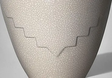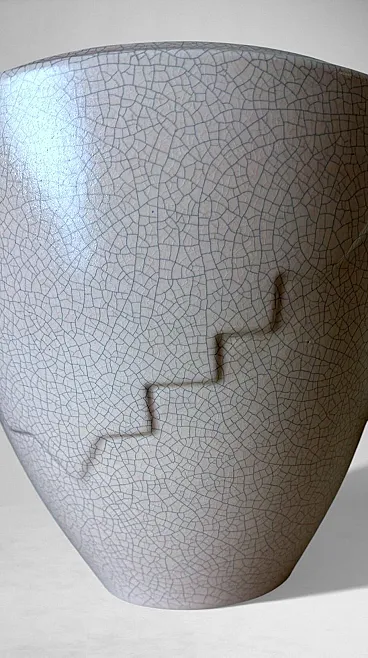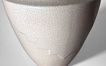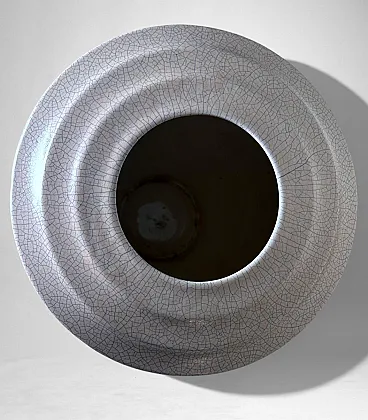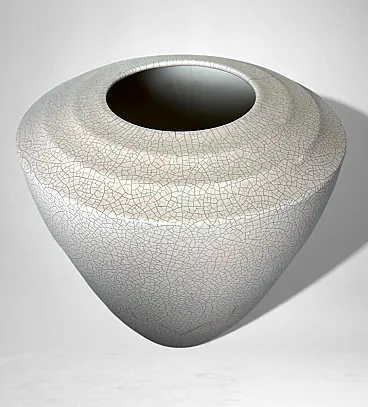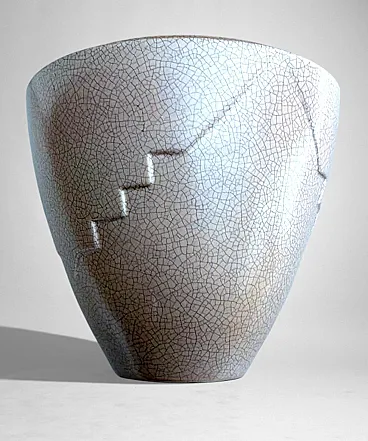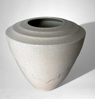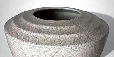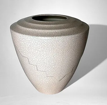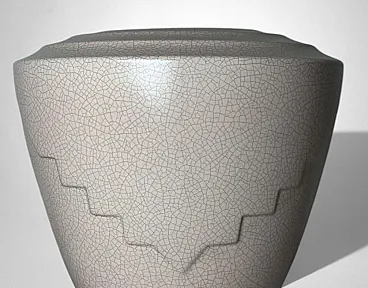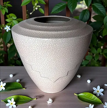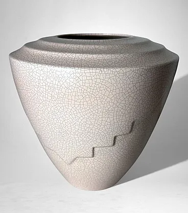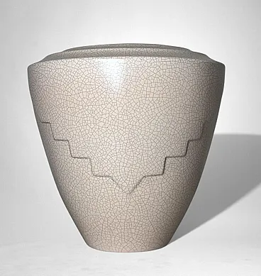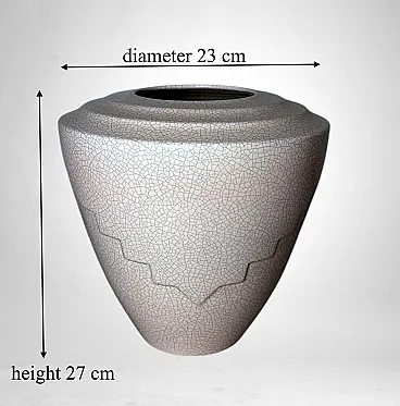 This elegant French vase was created in the Art Deco style and features a clean, understated design characterized by soft, harmonious lines. The form is enhanced by a refined and minimalist raised decoration on the body, adding visual interest while preserving the purity of the silhouette. The piece was produced in France between 1930 and 1935 in a small artisanal workshop located in the Marais district, one of Paris’s most historic and culturally rich neighborhoods. Long renowned for its community of artists and craftsmen, the Marais has traditionally been—and remains today—a vibrant center of creative production. The vase displays a striking craquelé finish. In painting, craquelure refers to the fine network of surface cracks that develops over time and is often used to help determine the age and authenticity of artworks. Toward the end of the 18th century, as decorative arts increasingly favored objects inspired by antiquity, craftsmen developed the craquelé technique as an intentional aging process, applying it to a wide range of materials, including ceramic and glass. Craquelé effects can be achieved through chemical methods that act on the glaze using specific substances to create a uniform, reticulated pattern. However, the most highly regarded approach is the Japanese Raku technique. This process involves firing the glazed object at high temperatures and then rapidly cooling it by removing it from the kiln. Careful control of timing and temperature is essential, as this dramatic thermal shock naturally produces the characteristic crackled surface. Raku firing results in objects that are inherently unique and unrepeatable, which is why the technique has been widely embraced by artists and designers seeking to create distinctive, expressive works. Such pieces are also especially appreciated by those drawn to natural textures, as the surface evokes the appearance of parched, water-deprived earth found in desert landscapes. This vase, executed using the Raku technique, represents a small but meaningful fragment of decorative arts history. It is a highly decorative object that draws the eye and integrates effortlessly into both classic and contemporary interiors. The vase is in good condition. Dimensions: Diameter: 23 cm (9.05 in) Height: 27 cm (10.63 in)