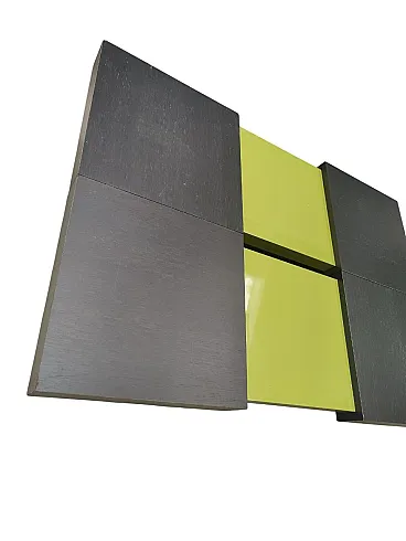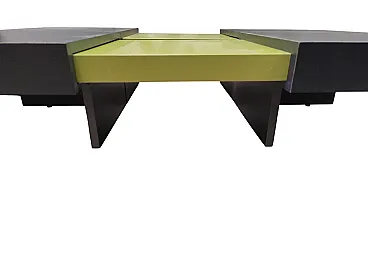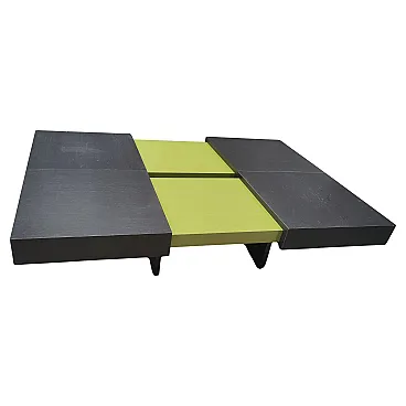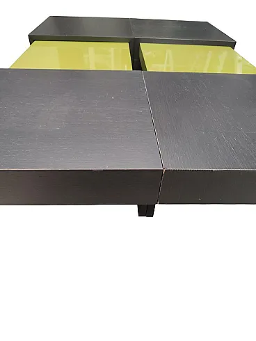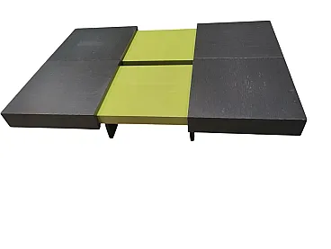 Dynamic and versatile sofa table with dimensions H 25 cm. X 90cm. X 90/130 cm. The Ligne Roset coffee table combines contemporary design and intelligent functionality. Thanks to the innovative sliding system, the two surfaces are easily transformed, adapting to different use needs. When closed, the top in an elegant wooden finish enhances any environment; once opened, the coffee table reveals two glossy green panels that immediately catch the eye, making it a true protagonist of the living space.