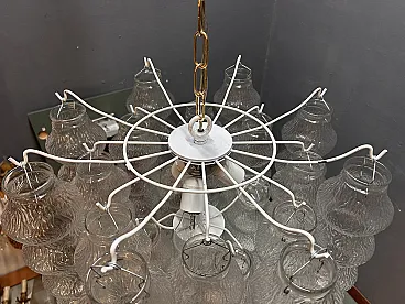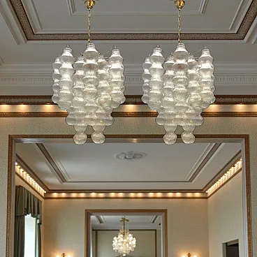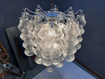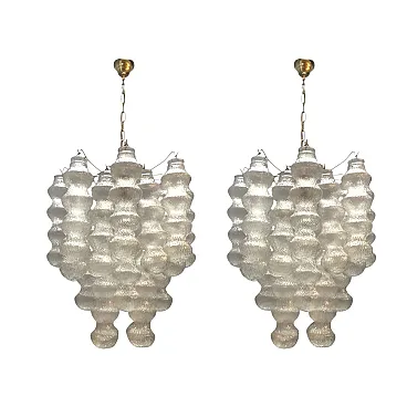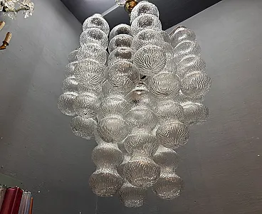 This stunning pair of 1980s Murano Bubble chandeliers features an eye-catching design with a series of intricately molded glass shades in the shape of a bubble. The soft, textured glass diffuses light in a warm and inviting way, creating a playful yet sophisticated atmosphere. Each chandelier is supported by an elegant metal structure with four sockets for E27 bulbs, which provide adequate lighting while enhancing the retro charm of the chandelier. The organic shape and unique glass elements make these chandeliers perfect for both contemporary and vintage-inspired interiors. Their delicate, diffused light creates a relaxing atmosphere, ideal for dining rooms, living rooms or modern entrances. The pair works beautifully together or as individual accents in different areas. Both chandeliers are equipped with new wiring, which ensures safety and readiness for installation. Each requires 4 E27 bulbs (not included) and has been professionally inspected to ensure optimal performance. Dimensions (for each chandelier) Total height (including chain): 117 cm Total height (without chain): 72 cm Diameter: 60 cm