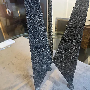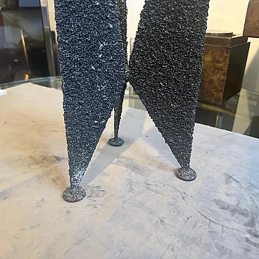 This striking 1980s Italian candelabra is a masterclass in Brutalist design, merging raw industrial strength with sophisticated Mid-Century flair. Hand-forged with a dramatic architectural presence, the piece features three soaring iron arms that terminate in substantial brass bobeches and candle nozzles. The juxtaposition between the textured, dark-patinated iron and the warm, polished glow of the brass elements creates a powerful visual contrast typical of late 20th-century avant-garde metalwork. Its tripod-style base provides exceptional stability while maintaining a slender, elegant silhouette that feels both ancient and modern. This candelabra remains in excellent vintage condition, showing a beautiful natural age to the metals that collectors of authentic Brutalist art deeply prize. Standing as a functional sculpture, it serves as a commanding centerpiece or a bold accent for a minimalist or eclectic interior.