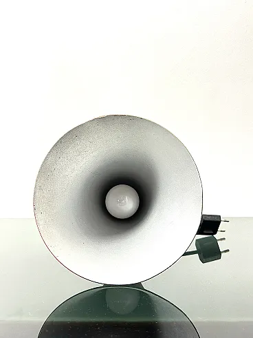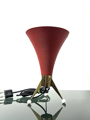 SPUTNIK table lamp, an iconic modern piece from the 1950s, Made in Italy. It is an emblematic example of mid-century design, characterized by a sculptural and evocative silhouette typical of the space age. This piece is a classic of Italian design, ideal for adding a touch of retro elegance to studies, living rooms or bedside tables. Red lacquered aluminum diffuser with textured finish (there are some cracks, see photo); base and stem in brass with original patina, ball feet in white plastic material that protect the surfaces. In good condition, in perfect working order. Dimensions: Height 24 cm - width 16 cm