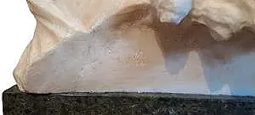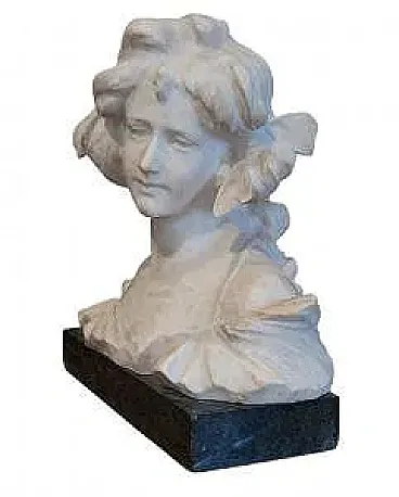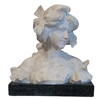 Refined alabaster bust depicting a young woman of noble elegance. The work stands out for the extraordinary delicacy of the face, characterized by a serene and dreamy expression, typical of the Romantic and Liberty taste of the time.