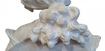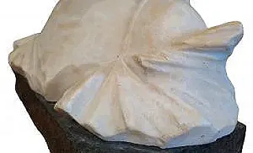 The attention to detail is masterful: the complex hairstyle moved by wispy curls is adorned with large silk ribbons (flakes), rendered with such realism that the lightness of the fabric is perceived. The treatment of the robe, with dense and delicate folds on the shoulders, highlights the sculptor's technical skill in transforming the hardness of the alabaster into soft and almost translucent surfaces. The work rests on a rectangular base in dark marble, which creates a chromatic contrast aimed at enhancing the purity of the white sculpture.
