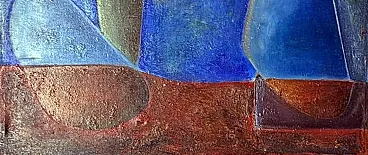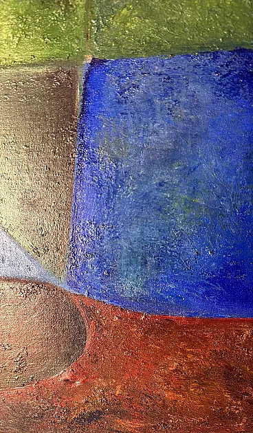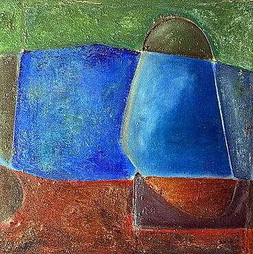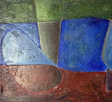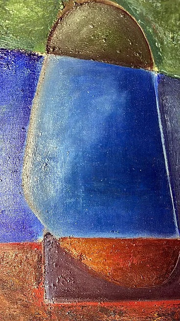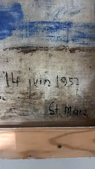 Important French abstract oil painting on canvas, dated June 1957, an authentic expression of post-war European artistic research. The work stands out for its balanced and refined composition, constructed through broad chromatic fields and soft, almost biomorphic forms that engage in a harmonious and measured dialogue. The pictorial texture reveals a conscious and confident use of material, with denser areas alternating with thinner, more transparent passages. The palette, dominated by deep blues, intense greens, warm browns, and subtle earthy tones, creates a strong visual impact while maintaining a remarkable sense of elegance. The painted surface is rich and vibrant: the oil application is carefully controlled, with slight irregularities and layered brushwork that lend depth, rhythm, and vitality to the overall composition. The painting fully belongs to the cultural climate of French Lyrical Abstraction and Art Informel, movements that favored the emotional expression of color and material over figurative representation. The result is a work of great balance, capable of conveying a sense of calm, introspection, and refined intellectual intensity. The biomorphic forms, the construction through chromatic fields, and the absence of direct figurative references recall the abstract research developed in France after World War II, in an ideal dialogue with artists such as Jean Bazaine, Alfred Manessier, Serge Poliakoff, or Nicolas de Staël (by formal analogy only, not by attribution). On the reverse of the canvas, a handwritten date “14 juin 1957” and an unclear signature (“St. Marz”) are visible, elements that confirm the authenticity and original nature of the work while leaving the attribution open to further research. The French inscription and the pictorial language strongly suggest execution in France, likely within an urban or artistic context connected to the major cultural centers of the period—such as Paris or other artistically active areas—although the exact location cannot be determined with certainty. Thanks to its well-proportioned dimensions and sophisticated palette, this painting is ideally suited to enhance contemporary, modernist, or mid-century modern interiors. It works beautifully above a sideboard, console, or sofa, in both residential settings and professional spaces such as studios, galleries, or executive offices. Its presence adds cultural depth and a strong artistic statement without appearing overpowering. An authentic, evocative work of notable pictorial quality, capable of engaging in a refined dialogue with European 20th-century art and design, ideal for collectors and admirers of historic abstract art. On the reverse, a well-executed period repair is visible; it does not affect the visual integrity of the painting, as clearly observable from the front of the artwork. Dimensions: width 66 cm (26 in), height 46 cm (18.1 in), depth 4 cm (1.6 in).