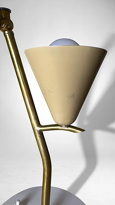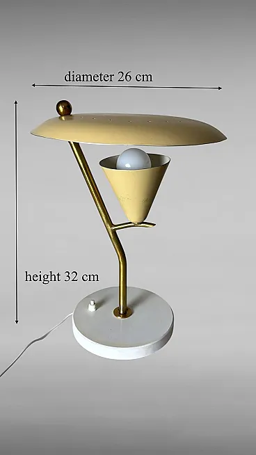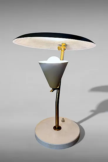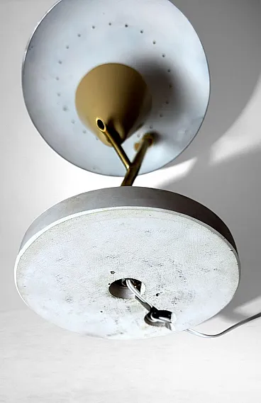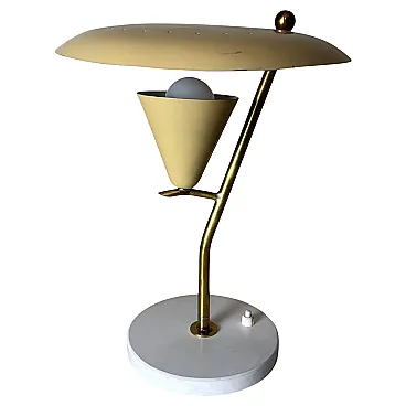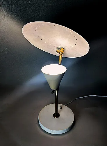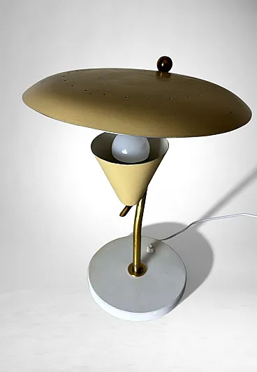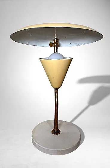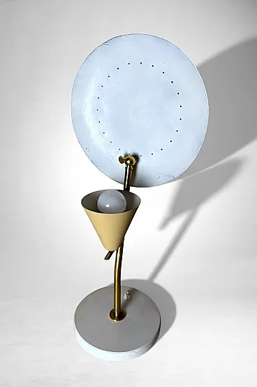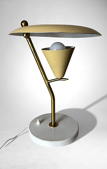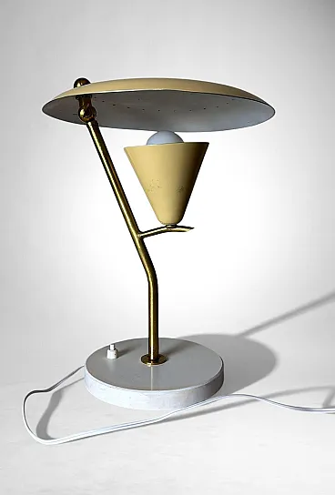 Elegant Italian table lamp from the late 1950s–early 1960s, crafted in enameled metal in soft pastel yellow and white tones, featuring a brass supporting structure and a painted stone base. The design, both balanced and distinctly sculptural, is defined by its refined asymmetrical composition and by the sophisticated adjustment system of the upper shade, connected to the stem through a pivoting joint that allows precise orientation of the light beam, enabling subtle modulation of both intensity and direction. This advanced technical solution reflects the innovative spirit of the most progressive Italian lighting manufacturers of the period. The internal conical diffuser, also in enameled metal, partially shields the light source, producing a soft, warm, and enveloping glow, further enhanced by the large perforated upper shade, which functions both as a reflector and as a striking decorative element. The carefully calibrated use of brass for the stem lends elegance and visual lightness to the composition, while the circular stone base ensures stability and solidity, harmoniously balancing the inclined structure. The refined chromatic contrast between white, pale yellow, and golden surfaces results in a highly sophisticated visual harmony, emblematic of the finest Italian postwar design. The execution, attributable to a high-level artisanal workshop active in the Lombardy area (Milan–Brianza), can be dated between 1958 and 1964. The formal language and construction solutions clearly recall the research of leading Italian manufacturers such as Stilnovo, Arredoluce, and Arteluce, as well as the influence of masters including Gino Sarfatti and Angelo Lelii, making this lamp a distinguished example of the golden age of Italian lighting design. A piece of strong decorative and collectible appeal, seamlessly blending function, engineering, and aesthetic research into a refined and well-balanced whole. Ideal for placement on a desk, writing table, console, or entryway furniture, this lamp integrates effortlessly into modernist, mid-century modern, contemporary, eclectic, and minimal-chic interiors. It is equally suited to enhancing classically inspired spaces reinterpreted in a modern key, where it can serve as a sophisticated focal point, enriching the environment with character and elegance. The lamp is in good condition, with only minor scratches on the painted part. Dimensions: Diameter: 32 cm (12.6 in) – Height: 26 cm (10.2 in).