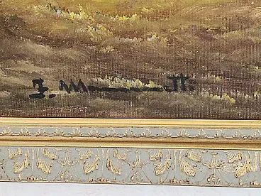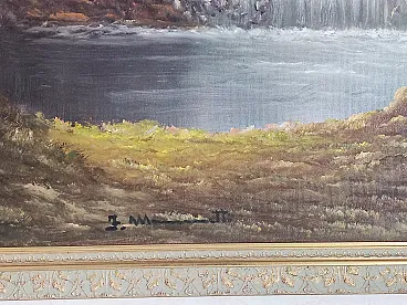 The work is oil on canvas, with soft brushstrokes and luminous hues ranging from the green of the meadows to the blue reflections of the water, to the delicate colors of the sunset sky. The composition recalls the tradition of 19th-century European landscapes, highly prized in classical furnishings.